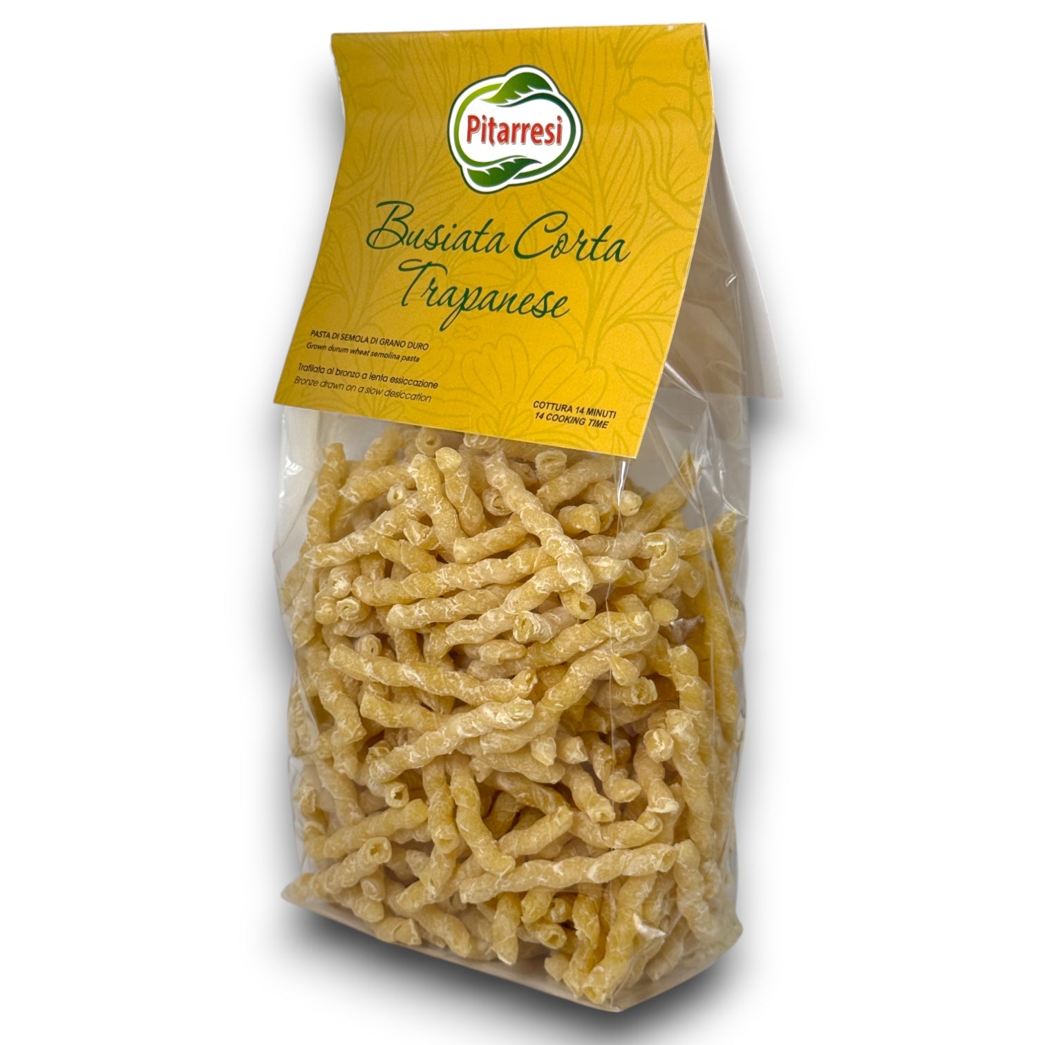 La nostra busiata corta Trapanese è una pasta tradizionale siciliana, trafilata al bronzo e realizzata con semola di grano duro. Il suo formato corto e arricciato trattiene perfettamente sughi e condimenti.