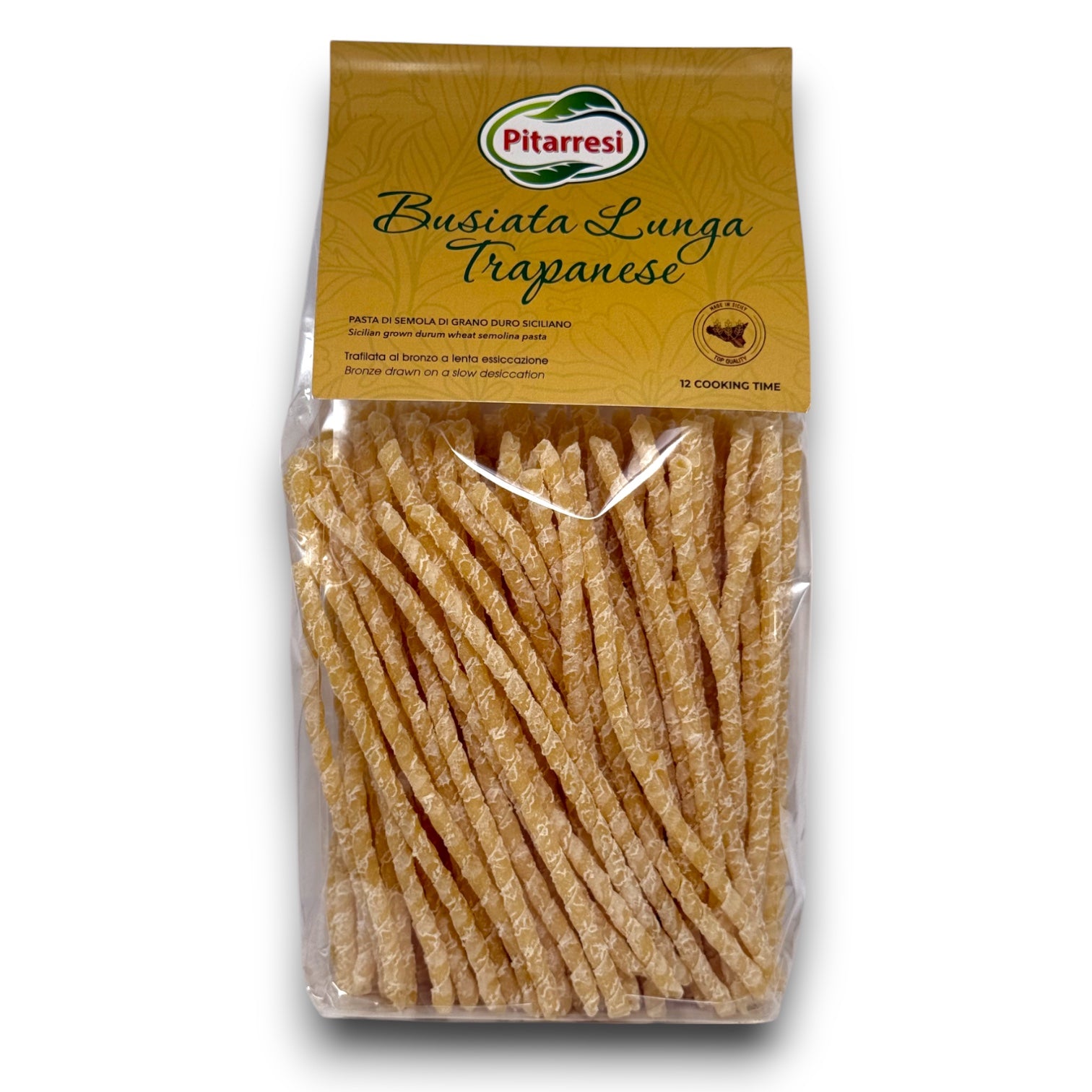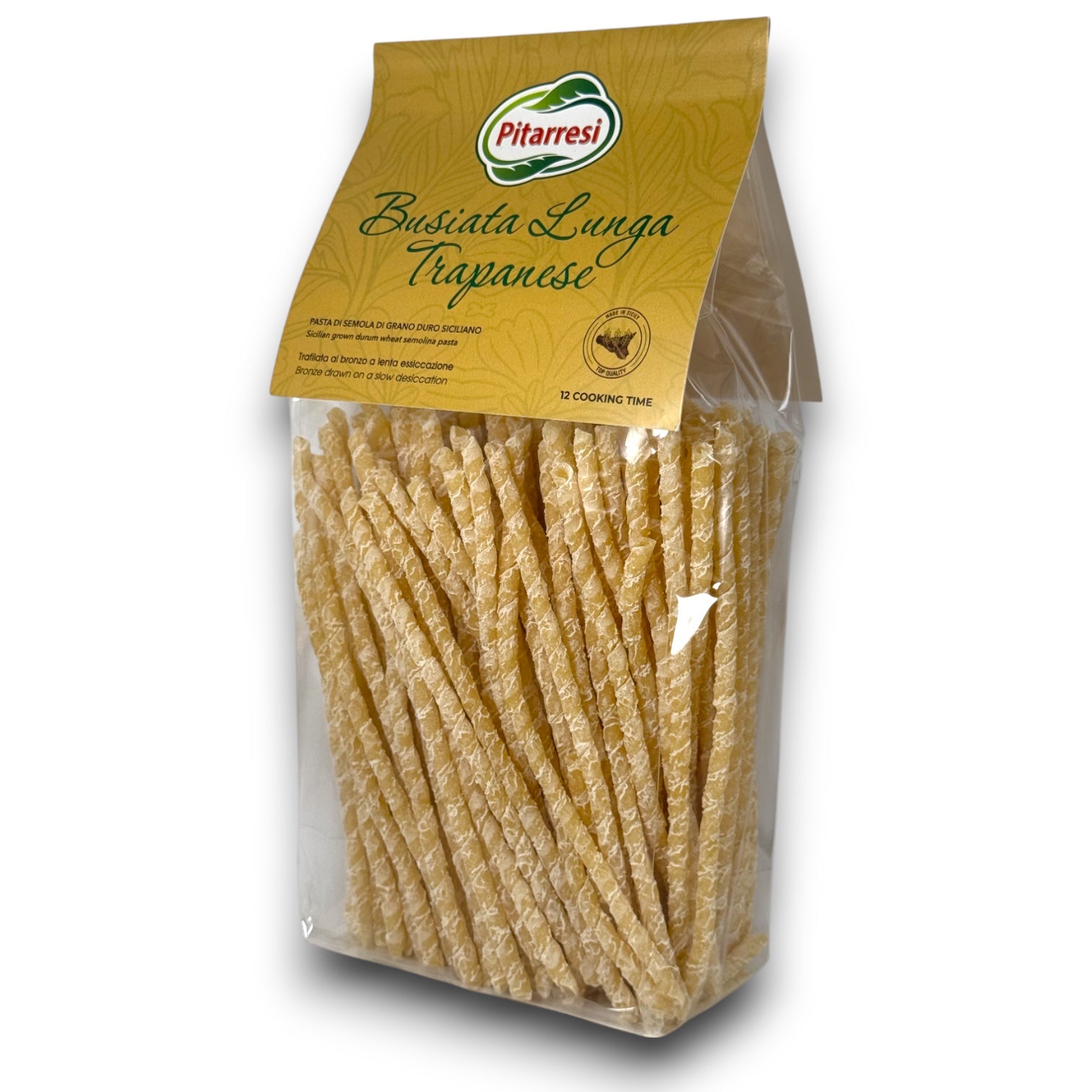 La nostra busiata lunga Trapanese è una pasta artigianale tipica della cucina siciliana, realizzata con semola di grano duro e trafilata al bronzo. La sua forma lunga e spiralata è perfetta per trattenere sughi corposi e condimenti ricchi.