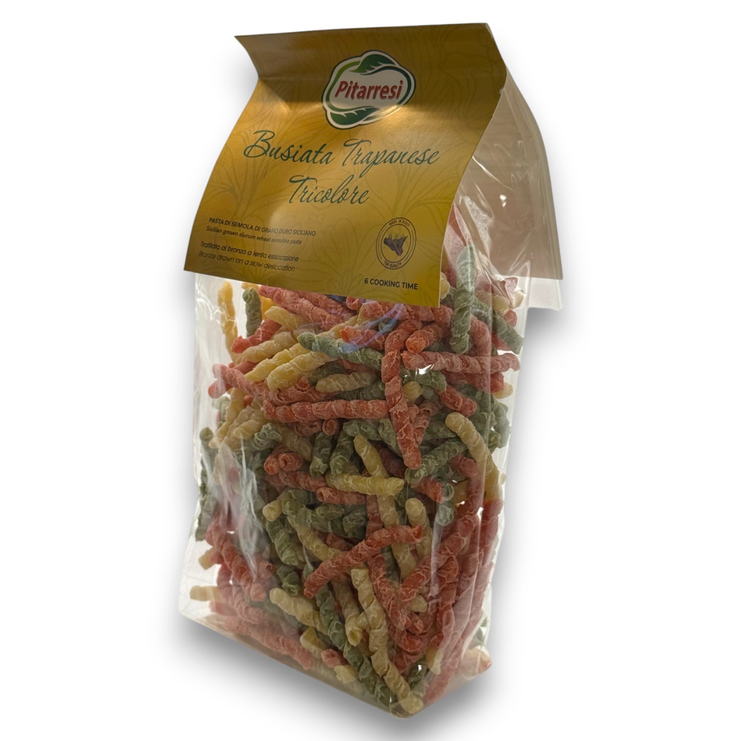 La nostra busiata trapanese tricolore è una pasta artigianale che unisce la tradizione siciliana a un tocco di colore naturale: verde con spinaci, rosso con pomodoro, e il classico giallo del grano duro. La sua forma elicoidale trattiene perfettamente ogni tipo di condimento, rendendola ideale per ricette creative e gustose.