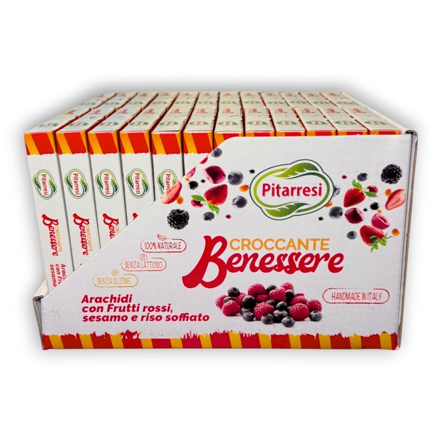 IngredientiArachidi (55%), zucchero, sciroppo di glucosio, miele, frutti rossi disidratati (mirtilli rossi 65%, zucchero, olio di girasole), semi di sesamo, riso soffiato.
