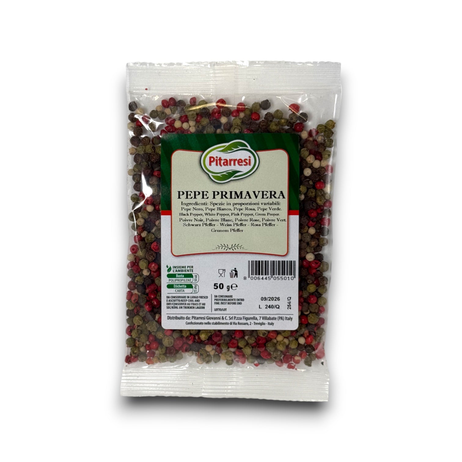 Il nostro pepe primavera è una miscela di pepi selezionati, pensati per esaltare i tuoi piatti con un tocco di colore e un’esplosione di profumi. Un blend raffinato e versatile, perfetto per dare vivacità a carni, verdure, formaggi e insalate con un gusto equilibrato ma deciso.